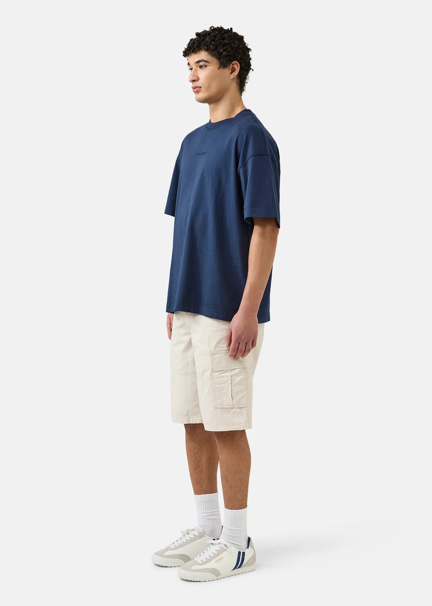 The Andrew Tee. Premium weight meets rich texture. This t-shirt is cut oversized from 200gsm cotton single jersey and garment dyed for a unique depth of color. Finished with an embroidered Patrick wordmark on the chest.